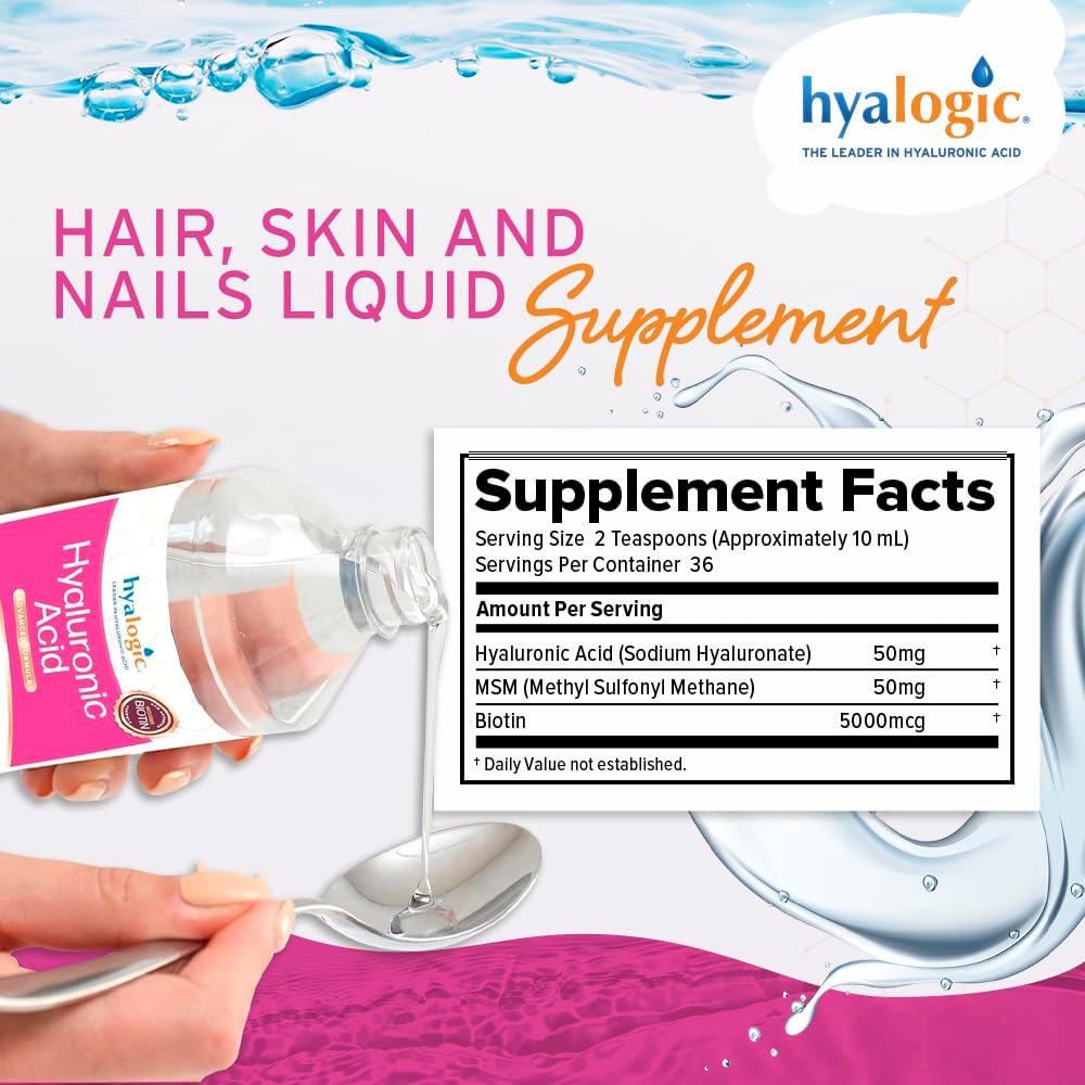 Nourish your beauty from within with Hyalogic® Hyaluronic Acid Advanced Liquid Formula for Hair, Skin & Nails. This powerful formula combines 50mg of Hyaluronic Acid, 5,000mcg of Biotin, and MSM to help support hydrated skin, strong nails, and healthy hair growth.* Biotin aids in maintaining structure and encouraging growth, while Hyaluronic Acid promotes elasticity and moisture retention in the skin.