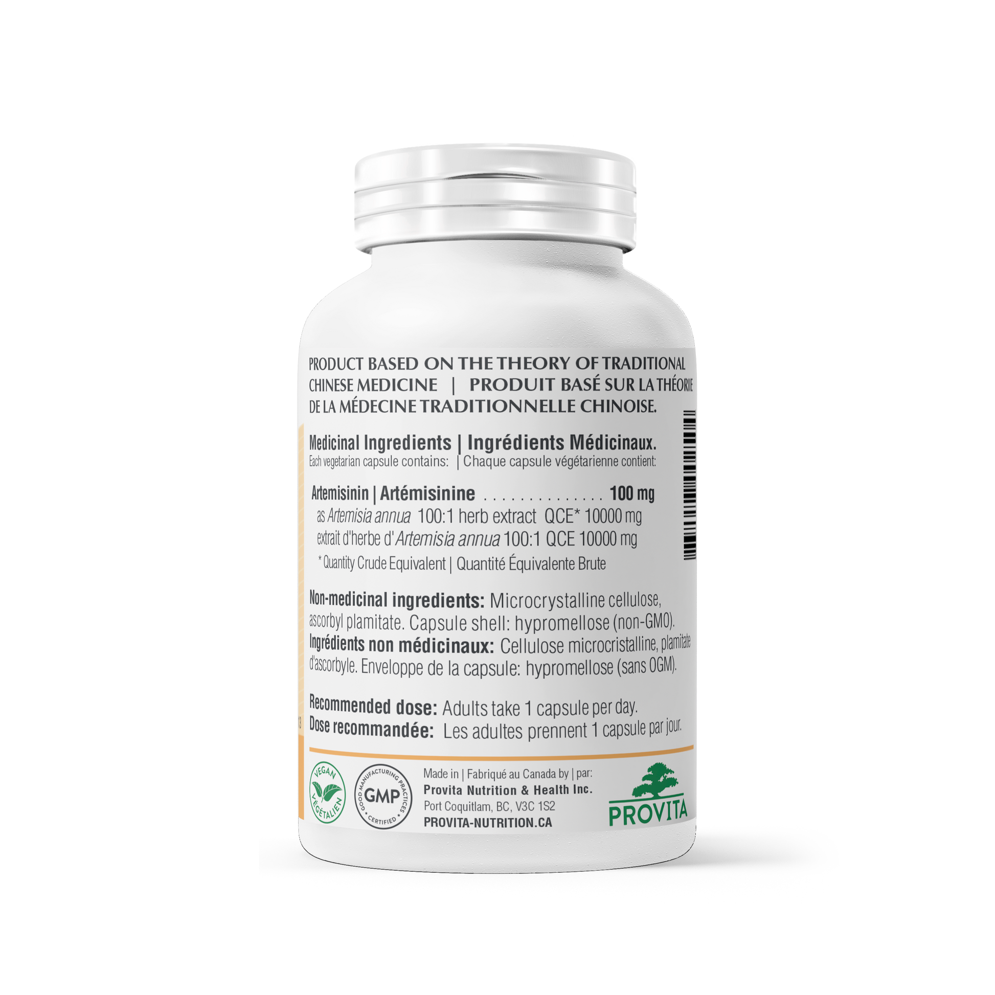 Each vegetarian capsule contains: Artemisinin 100 mg as Artemisia annua 100:1 herb extract QCE* 10,000 mg * QCE = Quantity Crude Equivalent