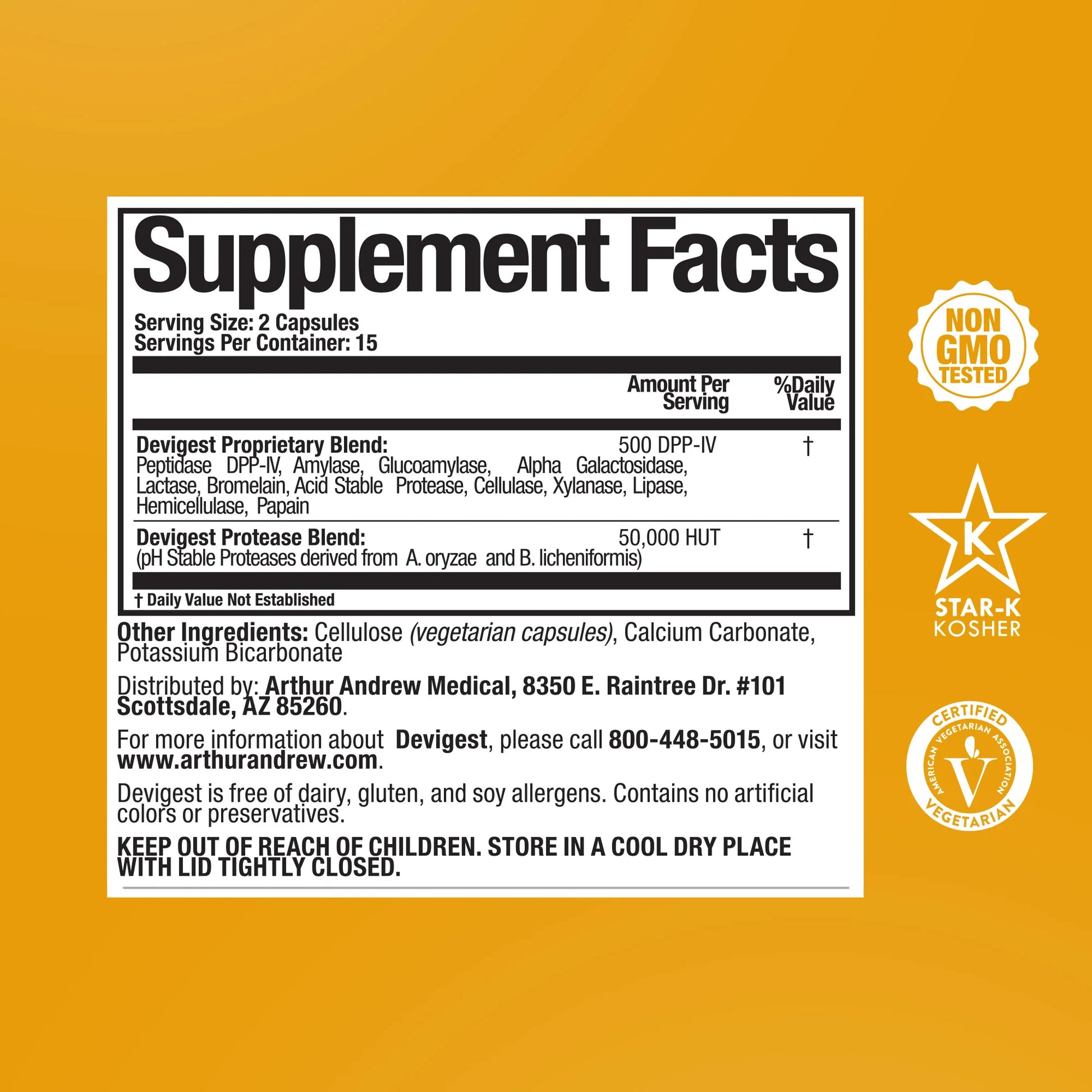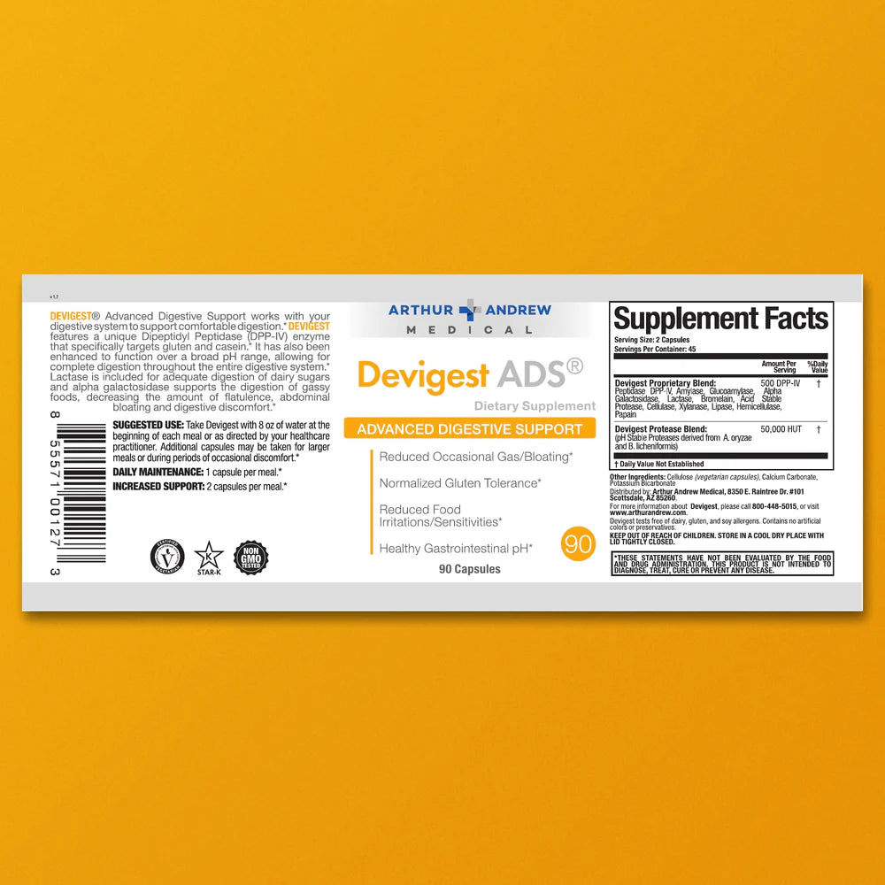 Devigest® is a broad‑spectrum digestive enzyme blend formulated to break down proteins, carbohydrates, fats, fibers, sugars, and even artificial ingredients in meals, helping to alleviate occasional gas, bloating, and discomfort from hard‑to‑digest foods such as gluten, lactose, and casein. It features a unique Dipeptidyl Peptidase (DPPIV) for gluten and dairy protein breakdown, functions over a wide pH range for complete digestion throughout the GI tract, and supports complete food assimilation.