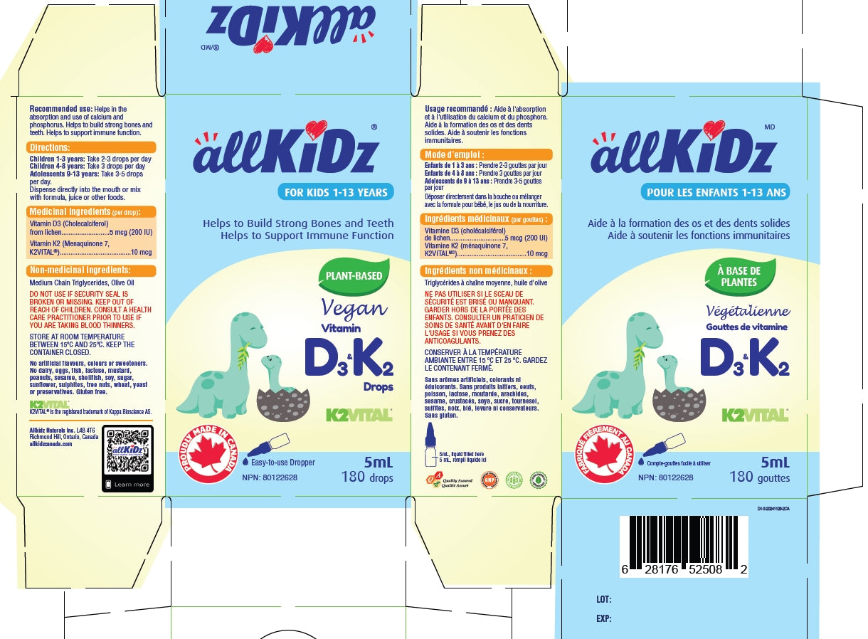 AllKiDz® Vegan Vitamin D3 & K2 Drops combine plant‑sourced vitamin D₃ (from lichen) and bioactive vitamin K₂ (as MK‑7) in one easy‑to‑use liquid formula to support bone mineralization, immune function, and healthy calcium utilization in children aged 1 year and above. The D₃ is certified vegan by the American Vegetarian Association and non‑GMO verified, while the K₂ is delivered as K2VITAL® MK‑7—patented for high absorption and also halal, vegan, and non‑GMO verified.