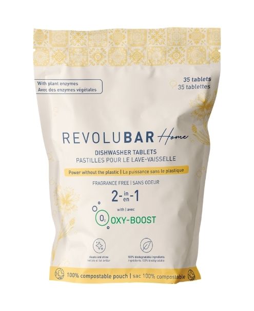 35 fragrance-free dishwasher tablets in a 100% compostable pouch