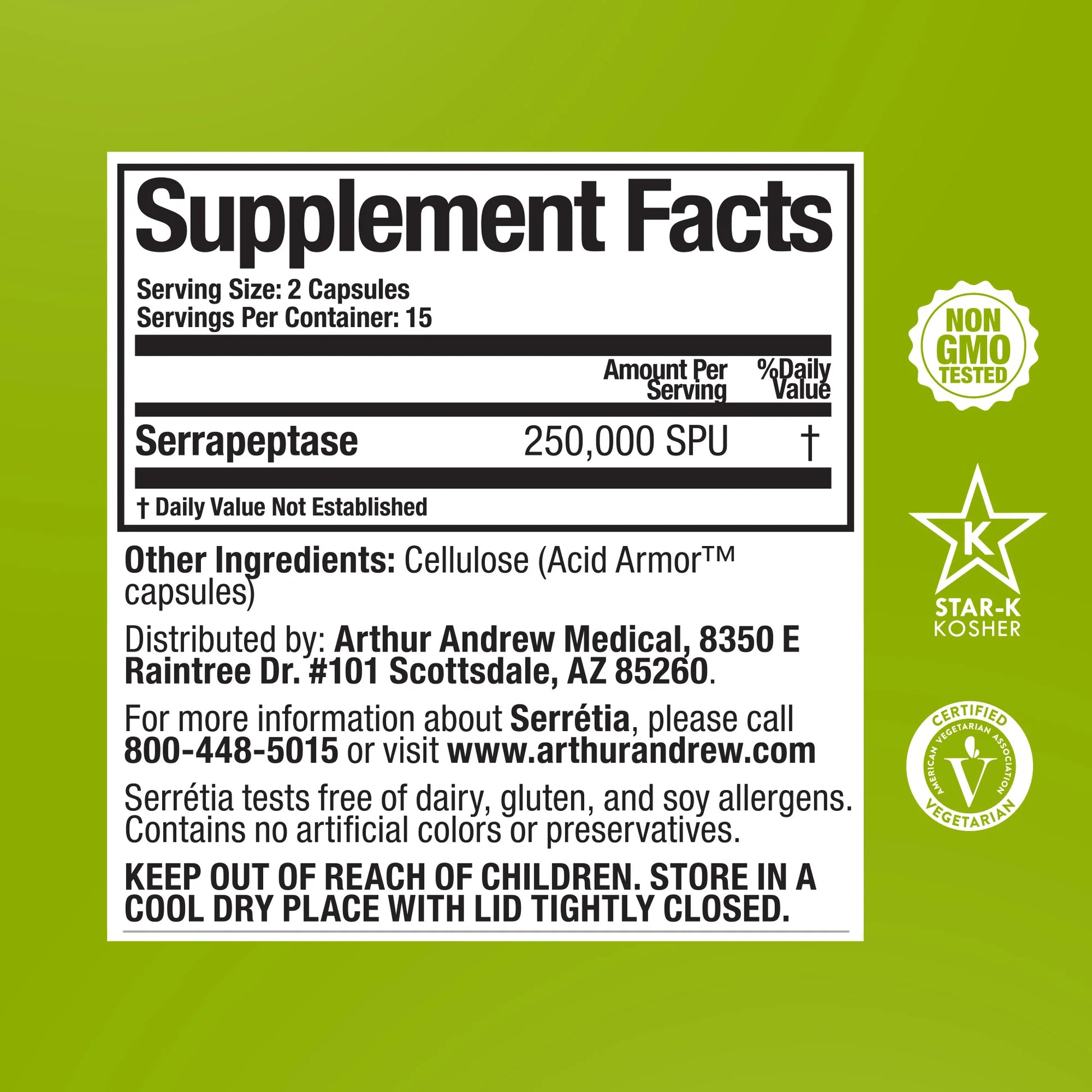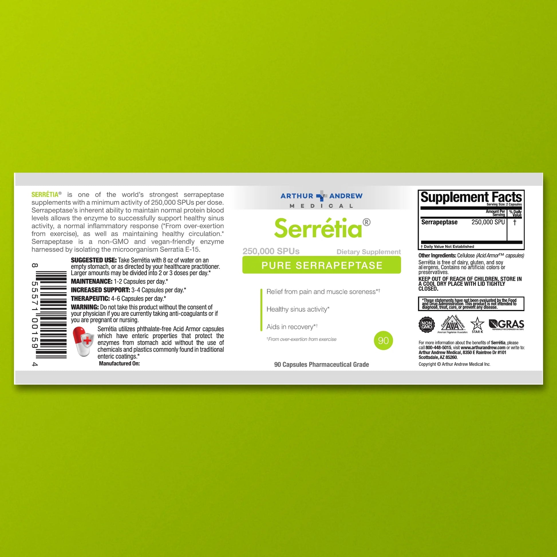 Serretia® by Arthur Andrew Medical is a high-potency serrapeptase supplement designed to support the body’s natural healing and recovery processes. Each serving delivers an impressive 250,000 SPUs (Serrapeptase Units) of pure serrapeptase, a powerful proteolytic enzyme known for breaking down non-living tissue and excess proteins.